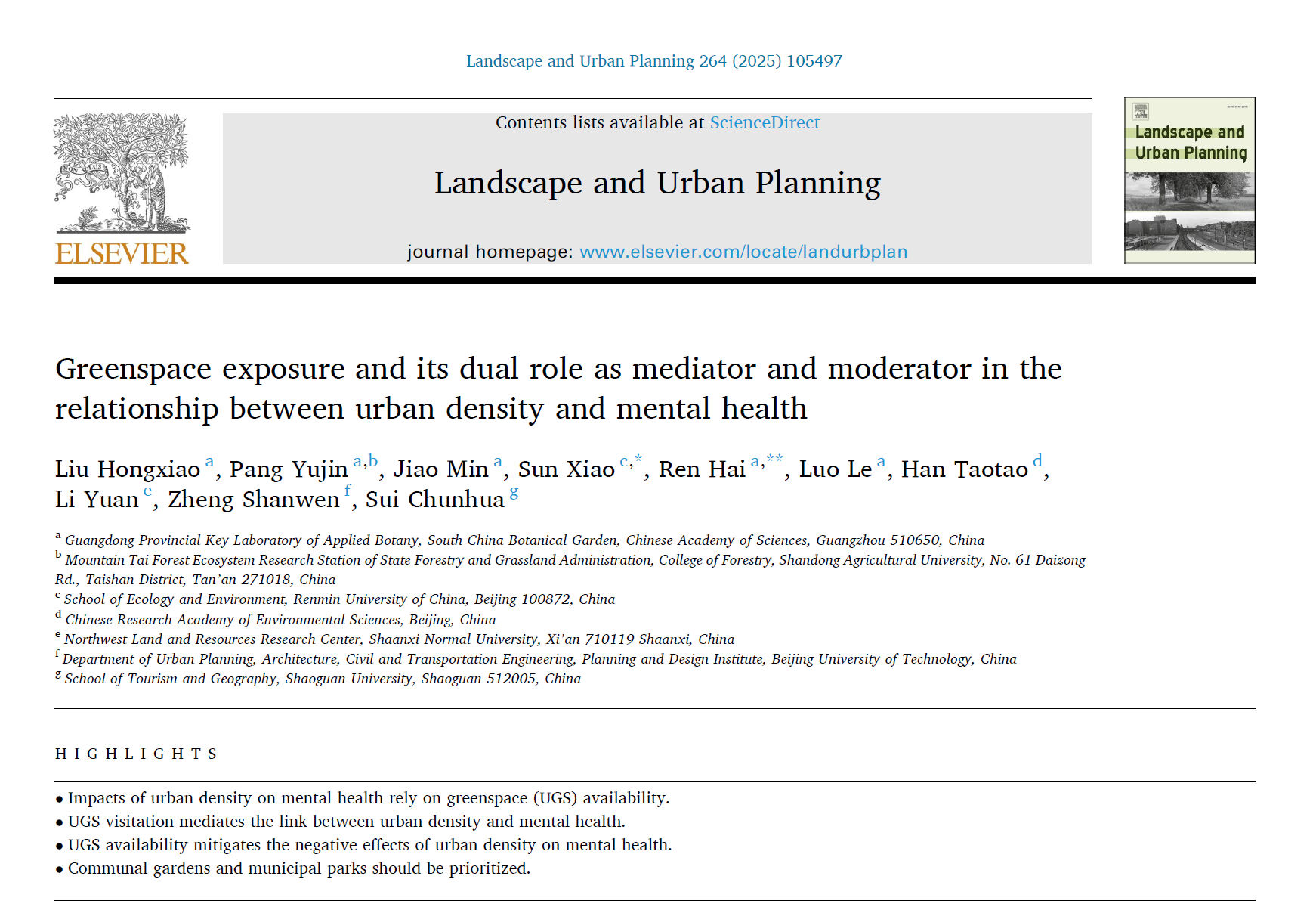 近日,威廉体育williamhill孙晓副教授作为通讯作者,与合作者的研究论文“Greenspace exposure and its dual role as mediator and moderator in the relationship between urban density and mental health”在景观生态学及城市规划领域国际顶级期刊Landscape and Urban Planning发表。